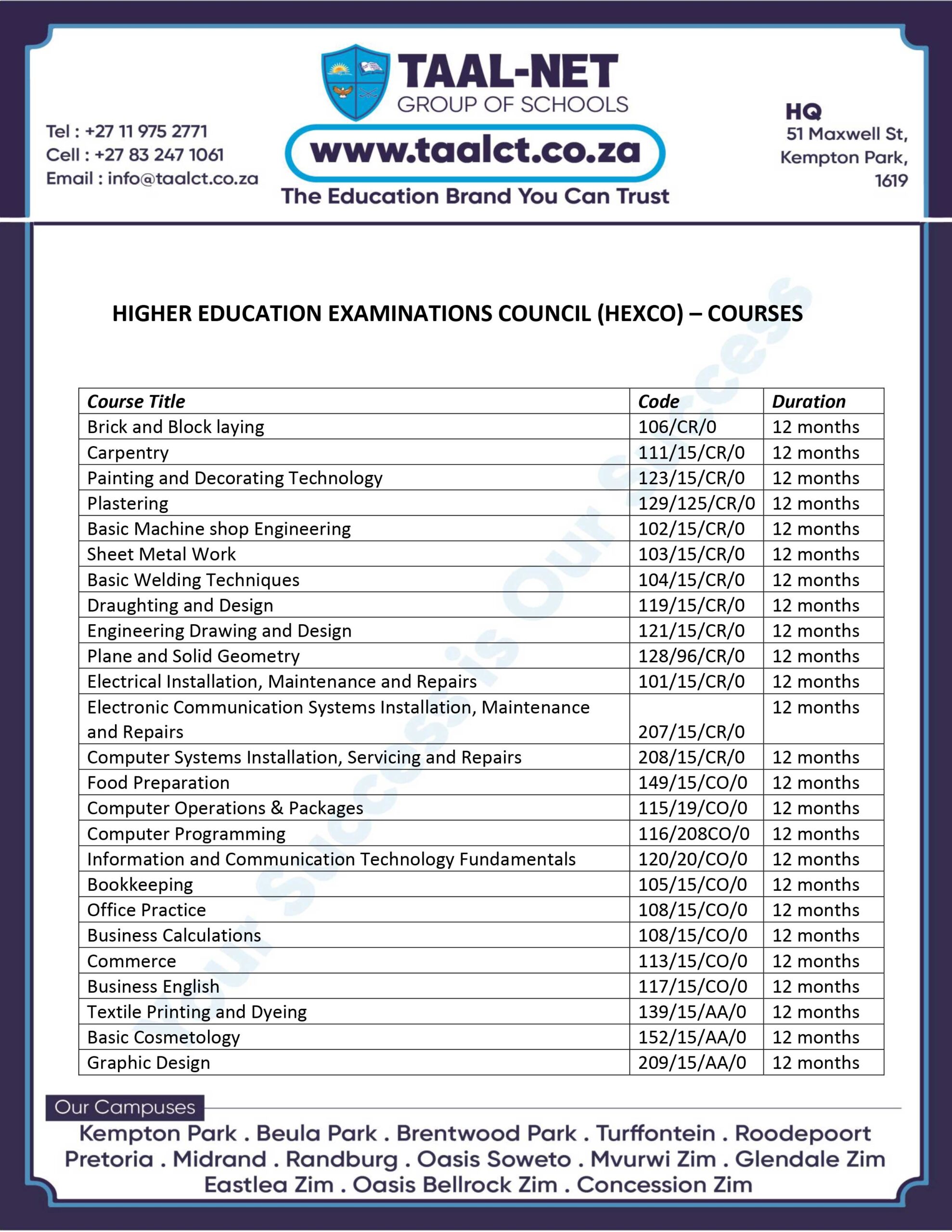 Taal-Net Group of Schools Zimbabwe is a HEXCO Center. We offer the following Courses: